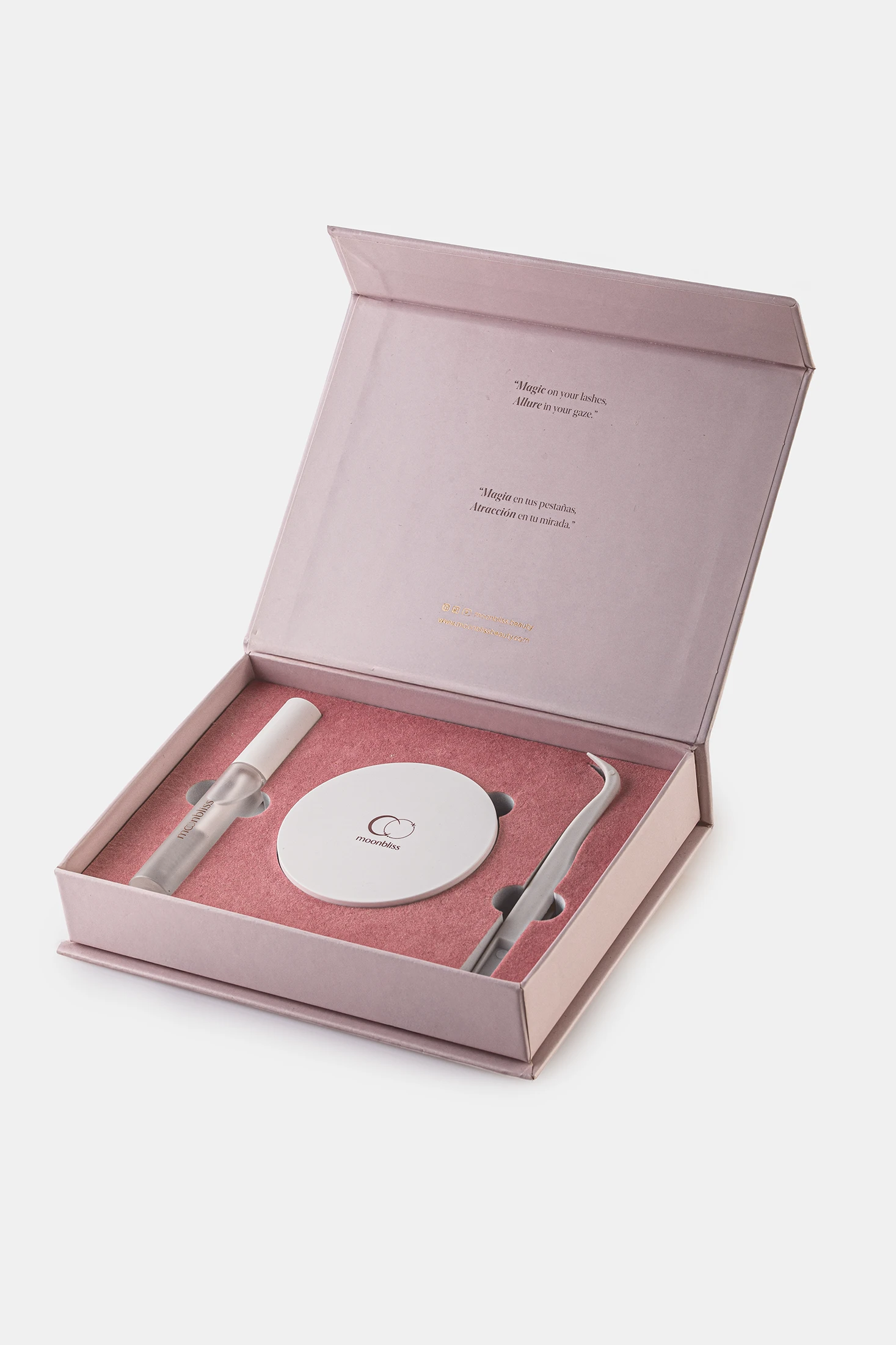 Riza tus pestañas naturales y aplica una capa de rímel fijador Moonbliss. Ideal para una sujeción duradera y segura.