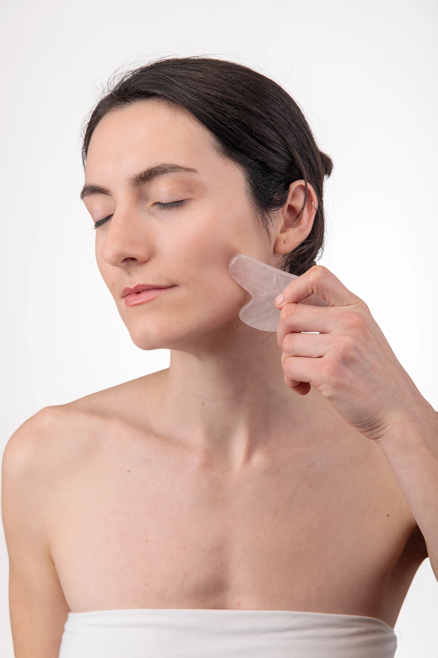La Jade Guasha es una herramienta de masaje facial hecha de cuarzo rosa, diseñada para moldear y tonificar la piel del rostro. Su superficie lisa permite un deslizamiento suave, ayudando a mejorar la circulación, reducir la tensión y aportar una sensación de relajación.